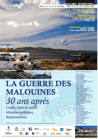 Ce colloque a eu lieu pendant 4 jours en France, les 15-16 octobre à Paris et les 18-19 octobre 2012 à Pau. Ce colloque pluraliste, transdisciplinaire et transnational, fut ouvert à tous ceux qui souhaitaient mieux comprendre les enjeux du différend anglo-argentin : juridiques, historiques, géopolitiques, économiques et stratégiques. Les thèmes abordés lors des séances thématiques furent : les faits militaires et diplomatiques, les interprétations historiographiques, les réalignements régionaux, en Europe et en Amérique, les approches géographiques et juridiques, ainsi que les vecteurs de commémoration -, acteurs, discours, transmissions et représentations.