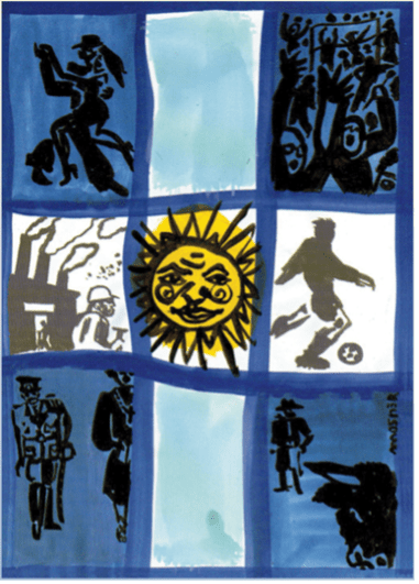 En politique : les cortèges de manifestants qui ont rythmé de façon indélébile l’histoire argentine. Les militaires aussi, omniprésents depuis le premier coup d’État de 1930, ainsi que la puissante Église Catholique. En économie, les industries et les ouvriers d’une époque révolue, celles des années du premier péronisme. Les marques culturelles sont, sans conteste, celles qui ont fait la renommée du pays, le tango, le football, le gaucho. Enfin, avec un regard de dessin animé, l’animal totem de la richesse argentine basée sur la rente agraire et l’élevage. Le tout sur fond de croix aux couleurs du drapeau argentin, avec au centre une note optimiste : le soleil généreux au visage humain ; le même soleil dit « incaïque » avec ces 32 rayons qui est dans l’emblème national depuis la déclaration de l’Indépendance en 1816. Ces clichés d’identité sont profondément ancrés dans la conscience collective et ce grand artiste, que nous aimons, les a fait émerger pour illustrer les activités de l’Observatoire de l’Argentine contemporaine. Le pinceau espiègle de Mosner nous rappelle un autre trait distinct des Argentins : l’humour et la dérision.