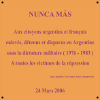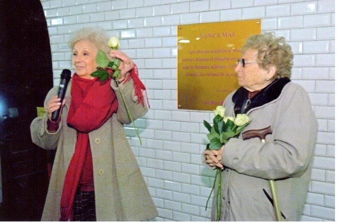 « La commémoration du 30e anniversaire du coup d’État le 24 mars 1976 revêt un intérêt tout particulier après l’annulation des lois d’amnistie… L’Observatoire de l’Argentine Contemporaine s’est associé à la semaine de la mémoire et de la justice en invitant Estela Carlotto, présidente de l’association des Grands-Mères de la Place de Mai, à venir en France pour participer à notre cycle de conférences et nous faire l’honneur de dévoiler la plaque « NUNCA MAS » à la station « Argentine », sur la ligne 1 du métro parisien ».
