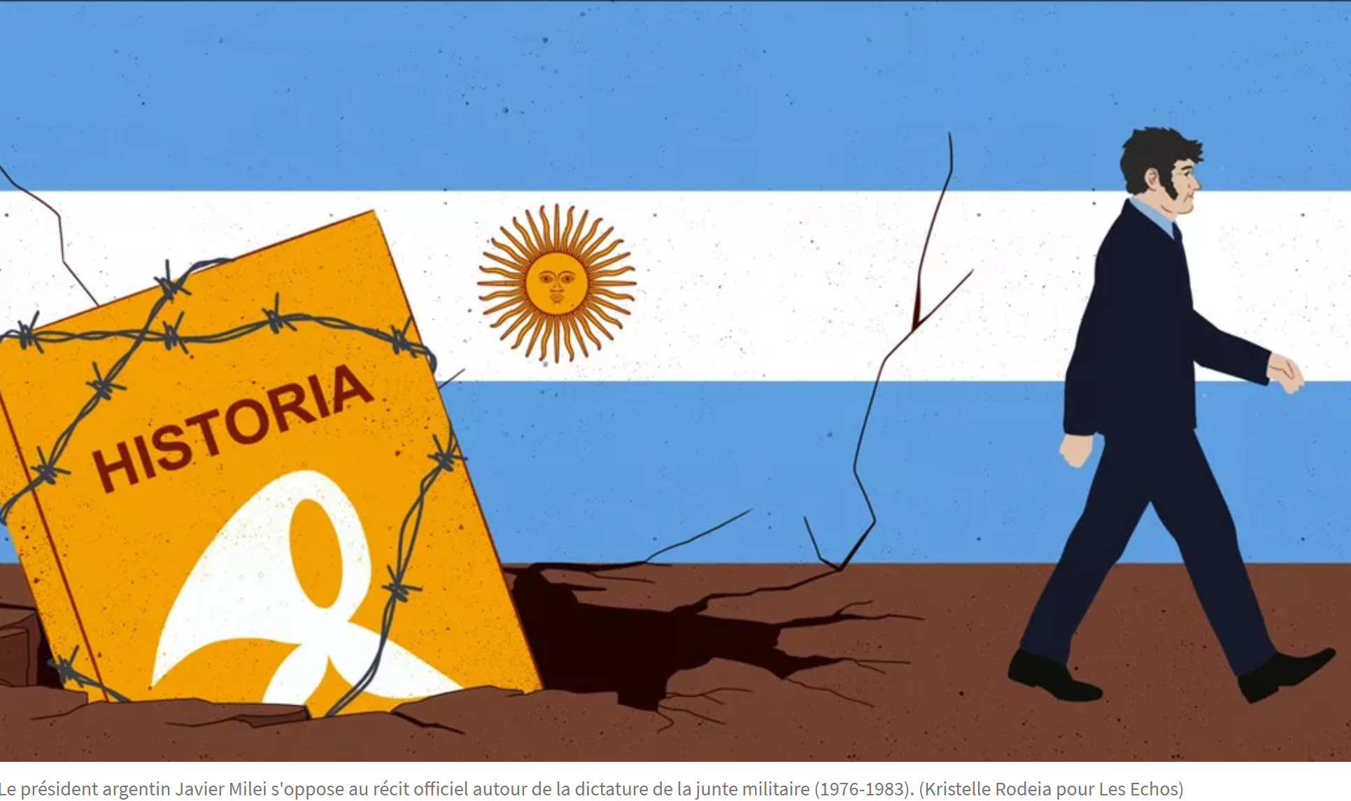 Argentine : quand Javier Milei réécrit le récit officiel de la dictature. Depuis son arrivée à la tête de l’Argentine fin 2023, Javier Milei livre une vraie lutte mémorielle contre l’histoire officielle de la dictature. En coupant dans les dépenses des organismes de droits humains et en niant le bilan officiel de la junte militaire, le président argentin revendique son révisionnisme. (Marion Torquebiau, 07/04/2025)