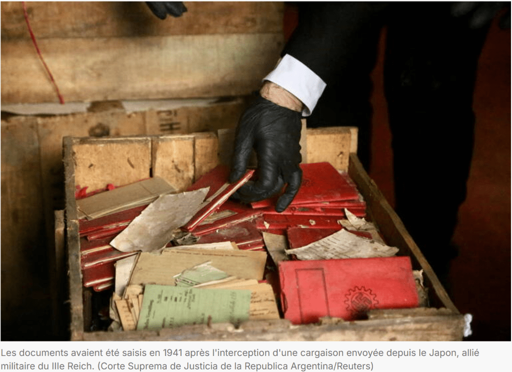 En Argentine, des caisses de champagne renfermaient des documents nazis. Les autorités ont découvert par hasard, au sous-sol de la Cour suprême à Buenos Aires, des milliers de documents saisis par les douanes en 1941. Ils pourraient renseigner les historiens sur l’étendue de l’influence nazie dans le pays pendant la guerre. (Samuel Ravier-Regnat, 13/05/2025)