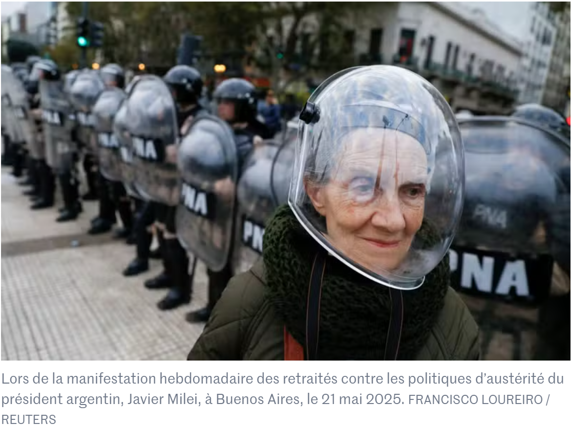 Argentine : le gouvernement limite fortement le droit de grève. Le gouvernement ultralibéral de Javier Milei a publié un décret imposant à de nouveaux secteurs d’assurer un niveau de 75 % de service minimum en cas de débrayage. La CGT a déposé un recours devant la justice. (Flora Genoux, 27/05/2025)
