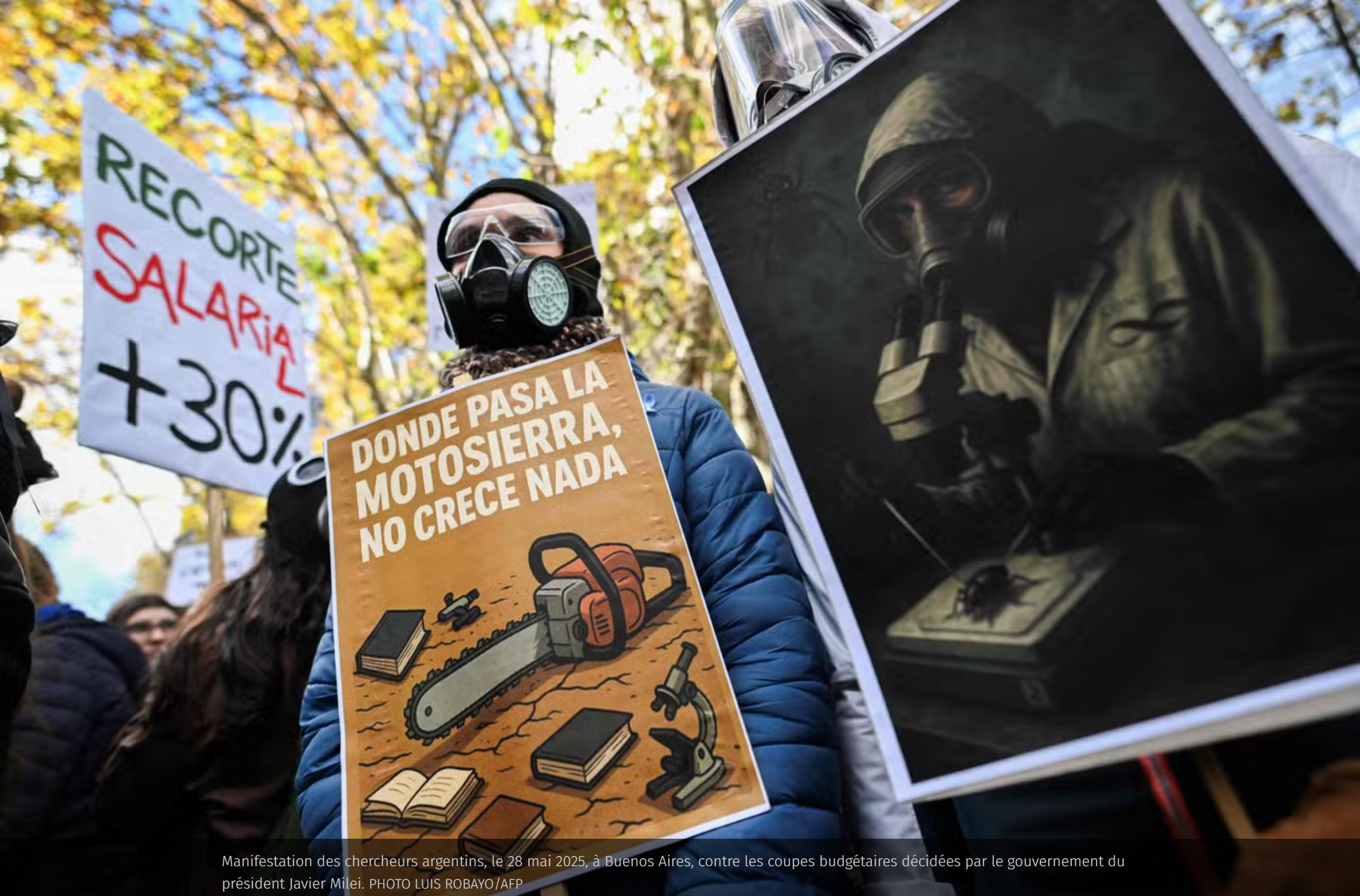 Argentine. “Non au scienticide !” : des milliers de chercheurs dans la rue contre la politique de Javier Milei. À Buenos Aires et dans plusieurs villes du pays, des milliers de scientifiques et chercheurs ont manifesté, mercredi 28 mai, contre les coupes budgétaires drastiques du gouvernement de Javier Milei. (29/05/2025)