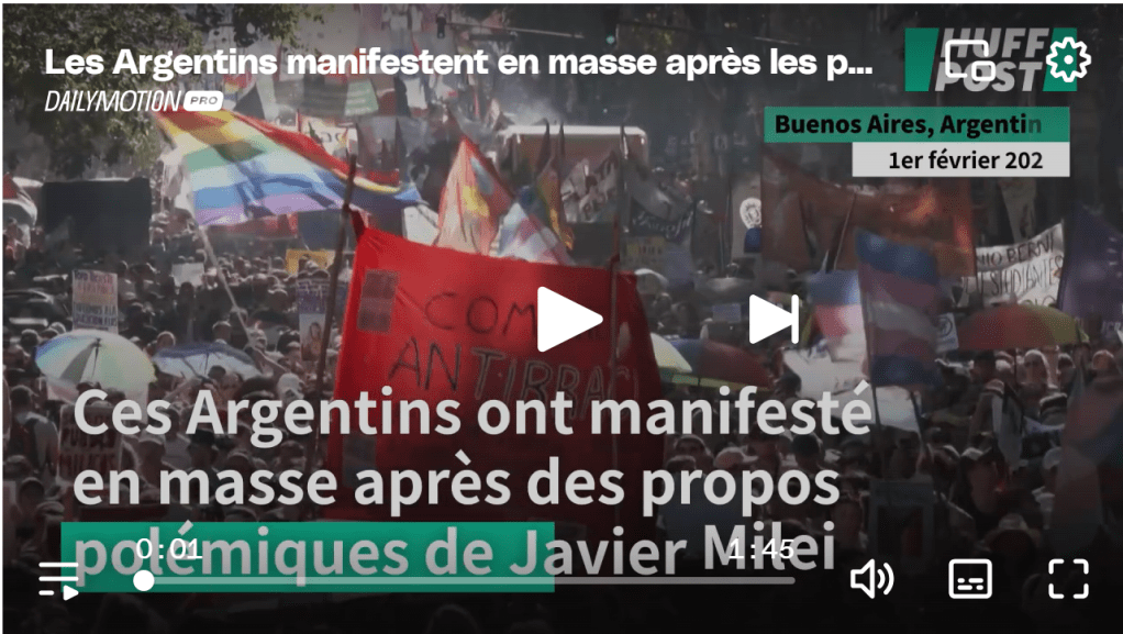 Argentine : le front antifasciste rend nerveux le président Milei. Une riposte d’envergure aux déclarations haineuses de Javier Milei est organisée le samedi 1er février à Buenos Aires et dans tout le pays. (Carlos Schmerkin, 29/01/25)