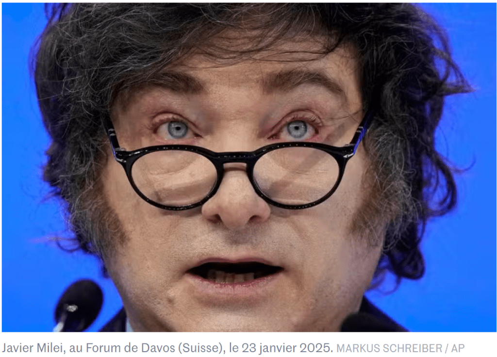 À Davos, Milei en croisade civilisationnelle. Négationniste climatique, anti-avortement, antiféministe, anti-LGTB, anti-migrants, contre les droits de toutes les minorités – sauf ceux de l’infime minorité des richissimes – , le discours de Javier Milei au sommet de Davos ce jeudi a condensé son idéologie. (21/01/2025)
