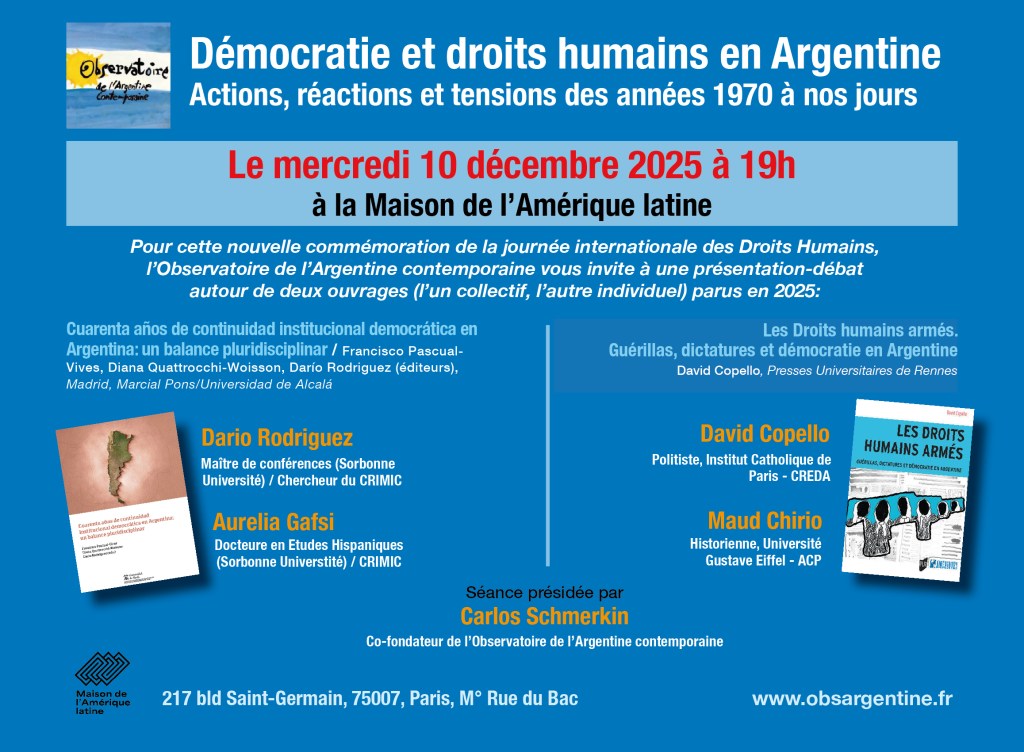 Pour cette nouvelle commémoration de la journée internationale des Droits Humains, l’Observatoire de l’Argentine contemporaine vous invite à une présentation-débat autour de deux ouvrages (l’un collectif, l’autre individuel) parus en 2025.