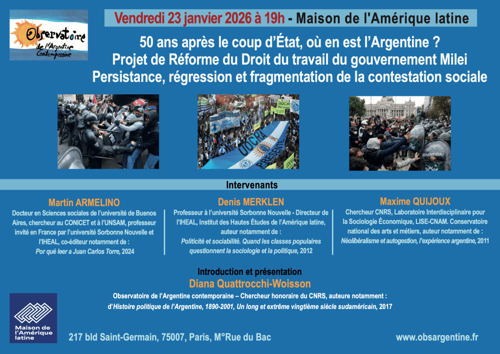 Conférence-débat « Projet de Réforme du Droit du travail du gouvernement Milei. Persistance, régression et fragmentation de la contestation sociale ». Le 23 janvier 2026 à 19h à la Maison de l’Amérique latine, avec :