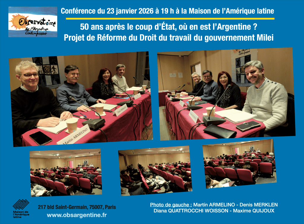 Conférence-débat « Projet de Réforme du Droit du travail du gouvernement Milei. Persistance, régression et fragmentation de la contestation sociale ». Le 23 janvier 2026 à 19h à la Maison de l’Amérique latine, avec :