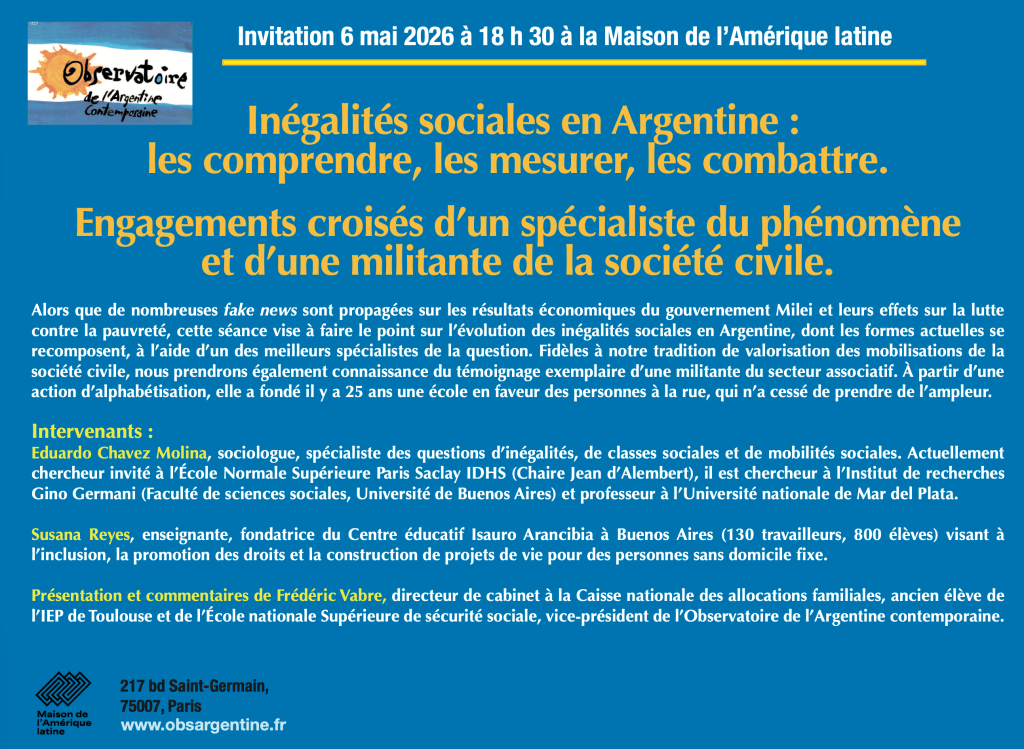 Alors que de nombreuses fake news sont propagées sur les résultats économiques du gouvernement Milei et leurs effets sur la lutte contre la pauvreté, cette séance vise à faire le point sur l’évolution des inégalités sociales en Argentine dont les formes actuelles se recomposent, à l’aide d’un des meilleurs spécialistes de la question. Fidèles à notre tradition de valorisation des mobilisations de la société civile, nous prendrons également connaissance du témoignage exemplaire d’une militante du secteur associatif. À partir d’une action d’alphabétisation, elle a fondé il y a 25 ans une école en faveur des personnes à la rue, qui n’a cessé de prendre de l’ampleur.